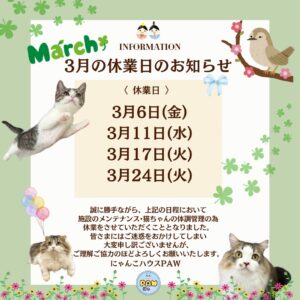 2026/02/28 いつもご利用ありがとうございます! 以下3月の休業日となります。 3/6(金)休業 3/11(水)休業 3/17(火)休業 3/24(火)休業 ご理解ご協力の程よろしくお願いいたします。